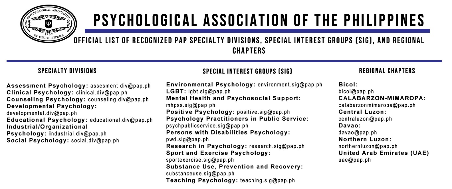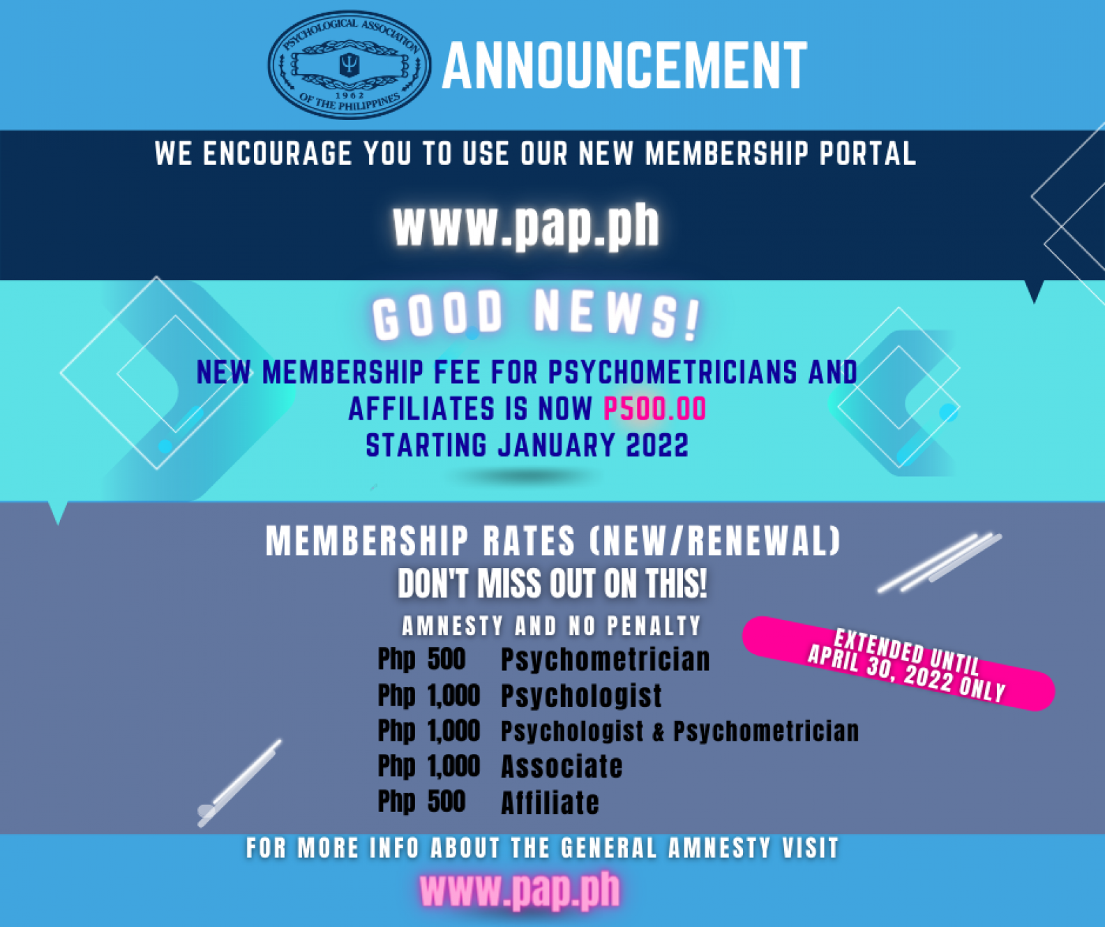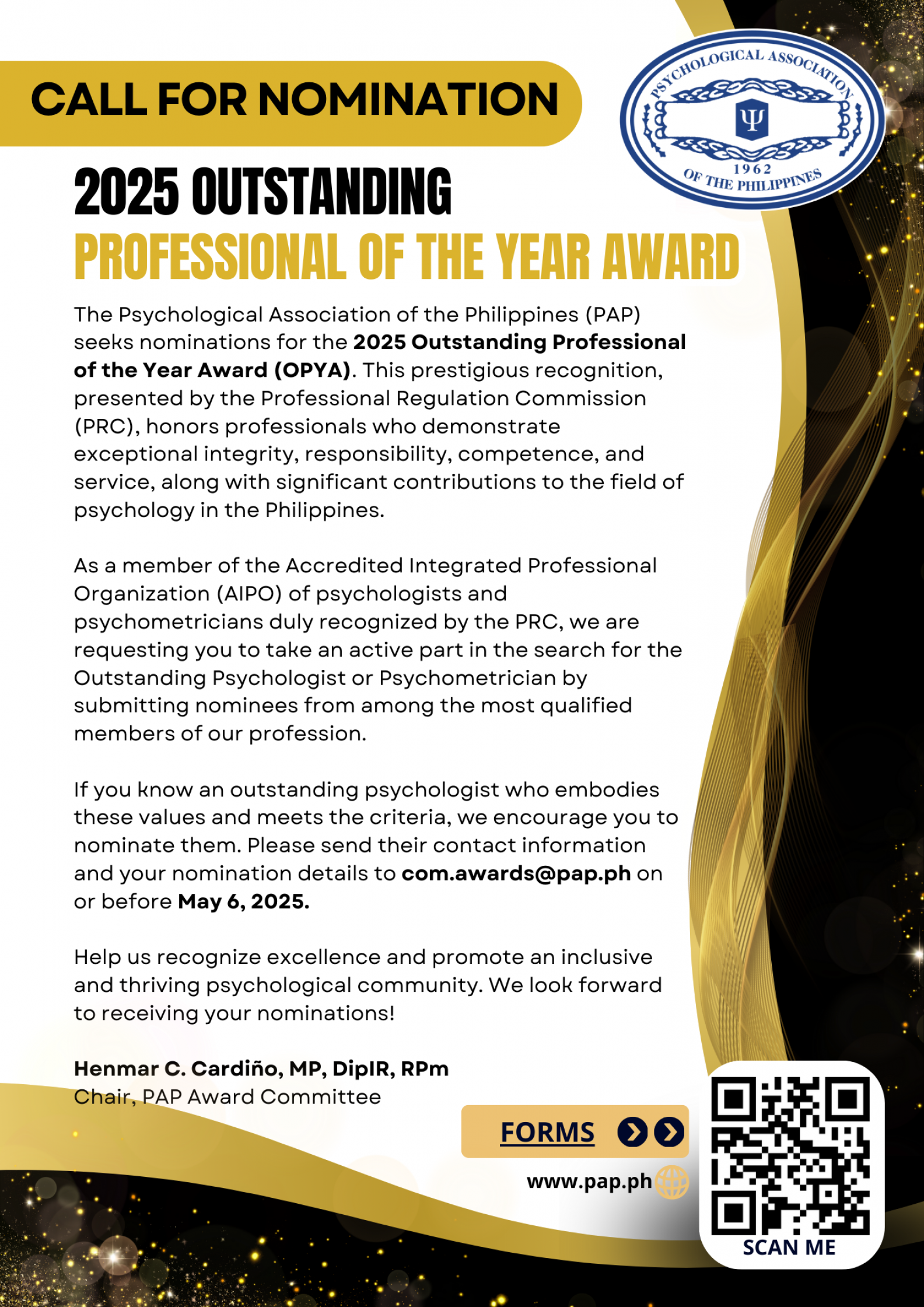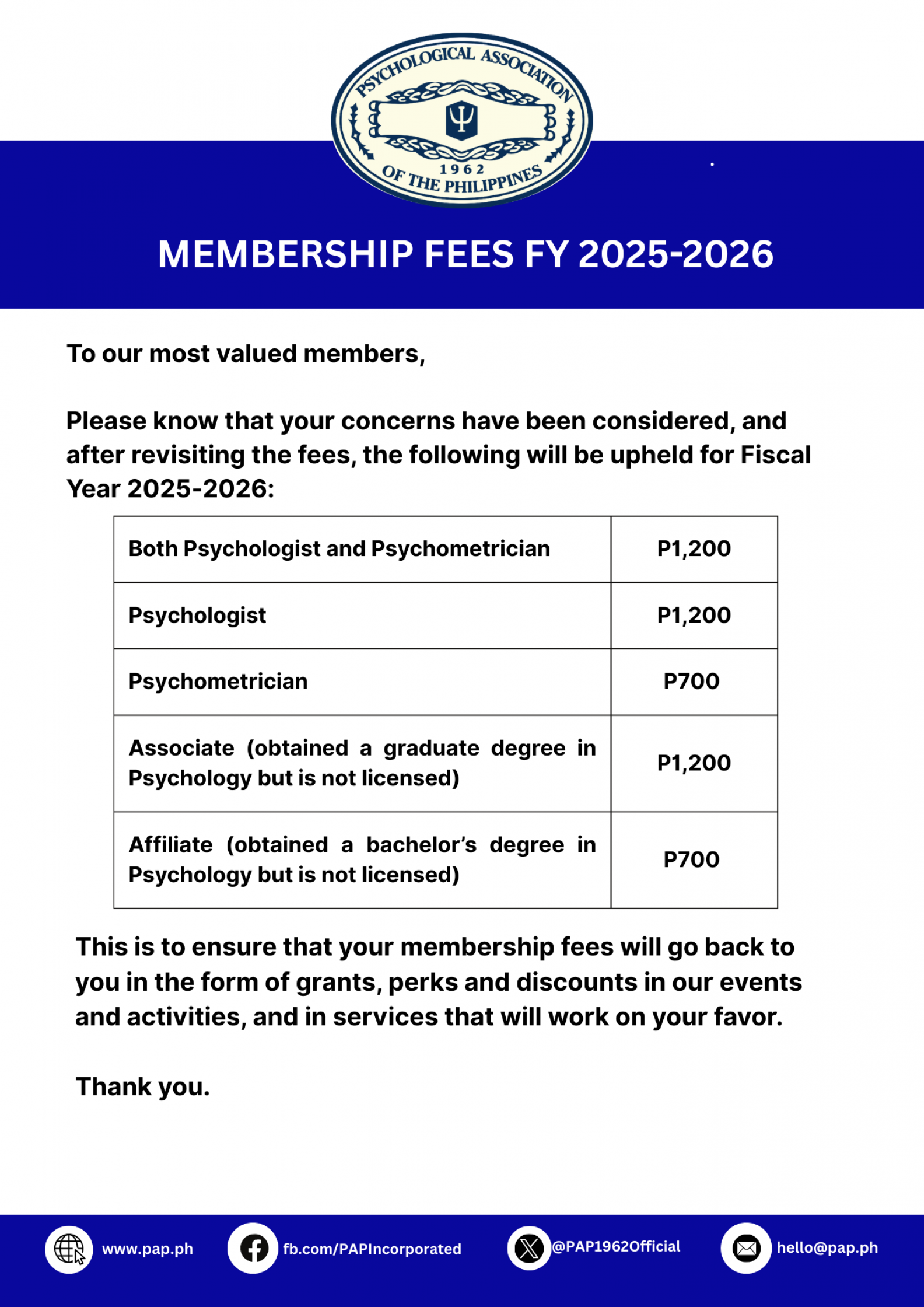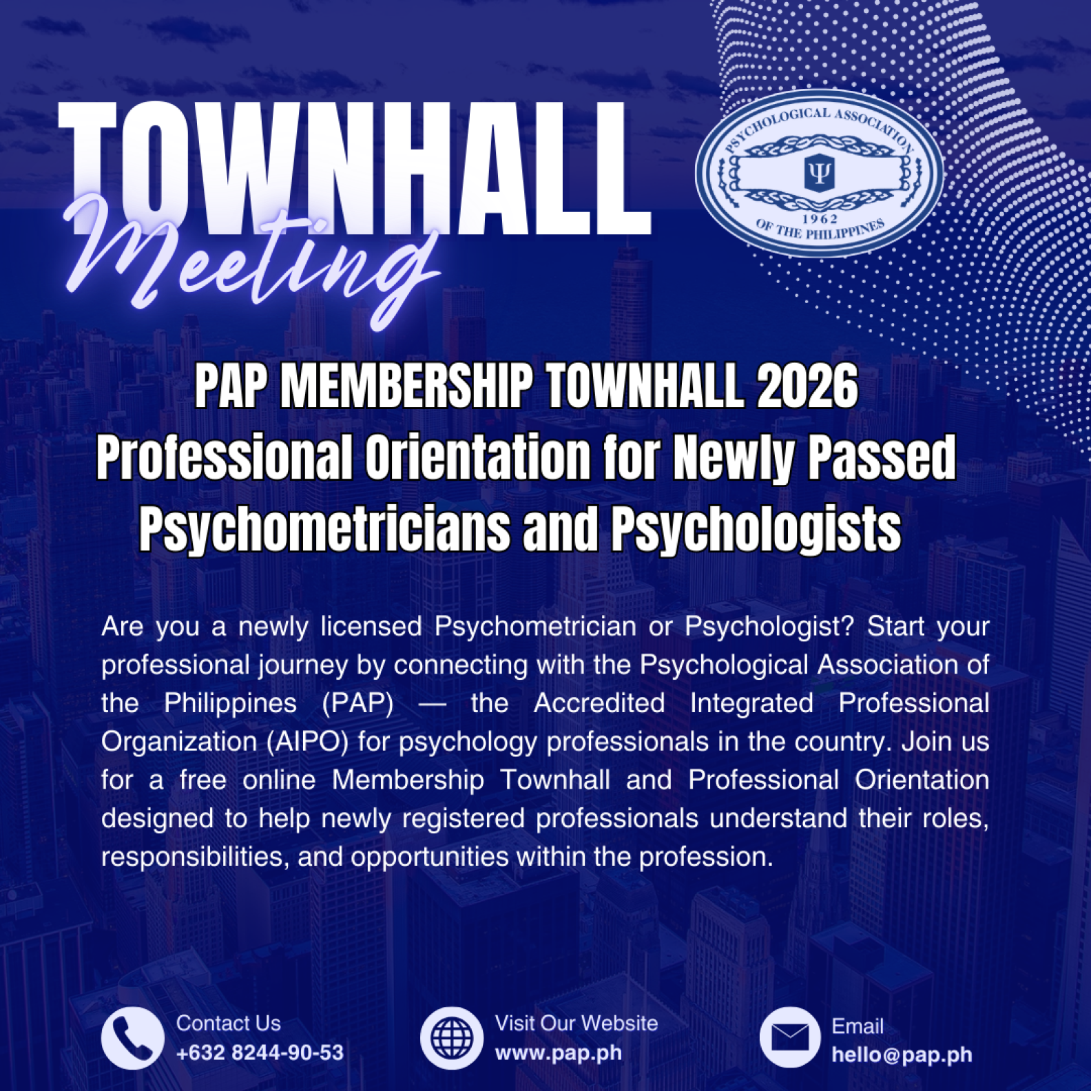 In line with this milestone, we encourage you to consider becoming a member of the Psychological Association of the Philippines (PAP), the nationally accredited professional organization for psychologists and psychometricians in the country. PAP serves as the leading body that upholds ethical standards, advances professional competence, and promotes the growth and development of psychology as a discipline and profession.