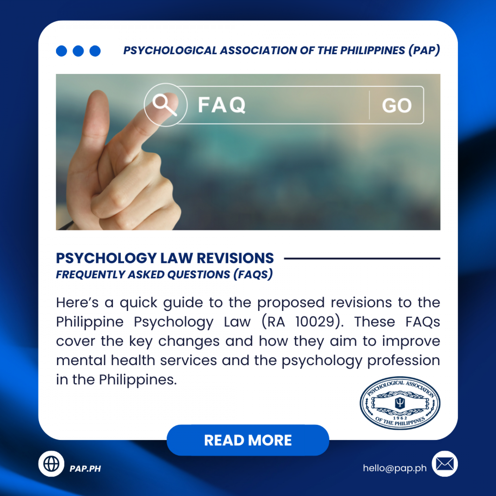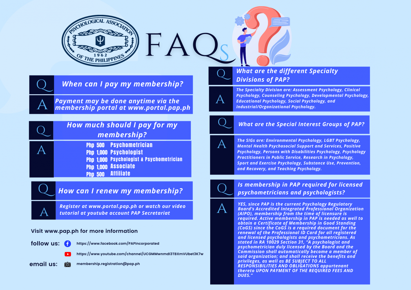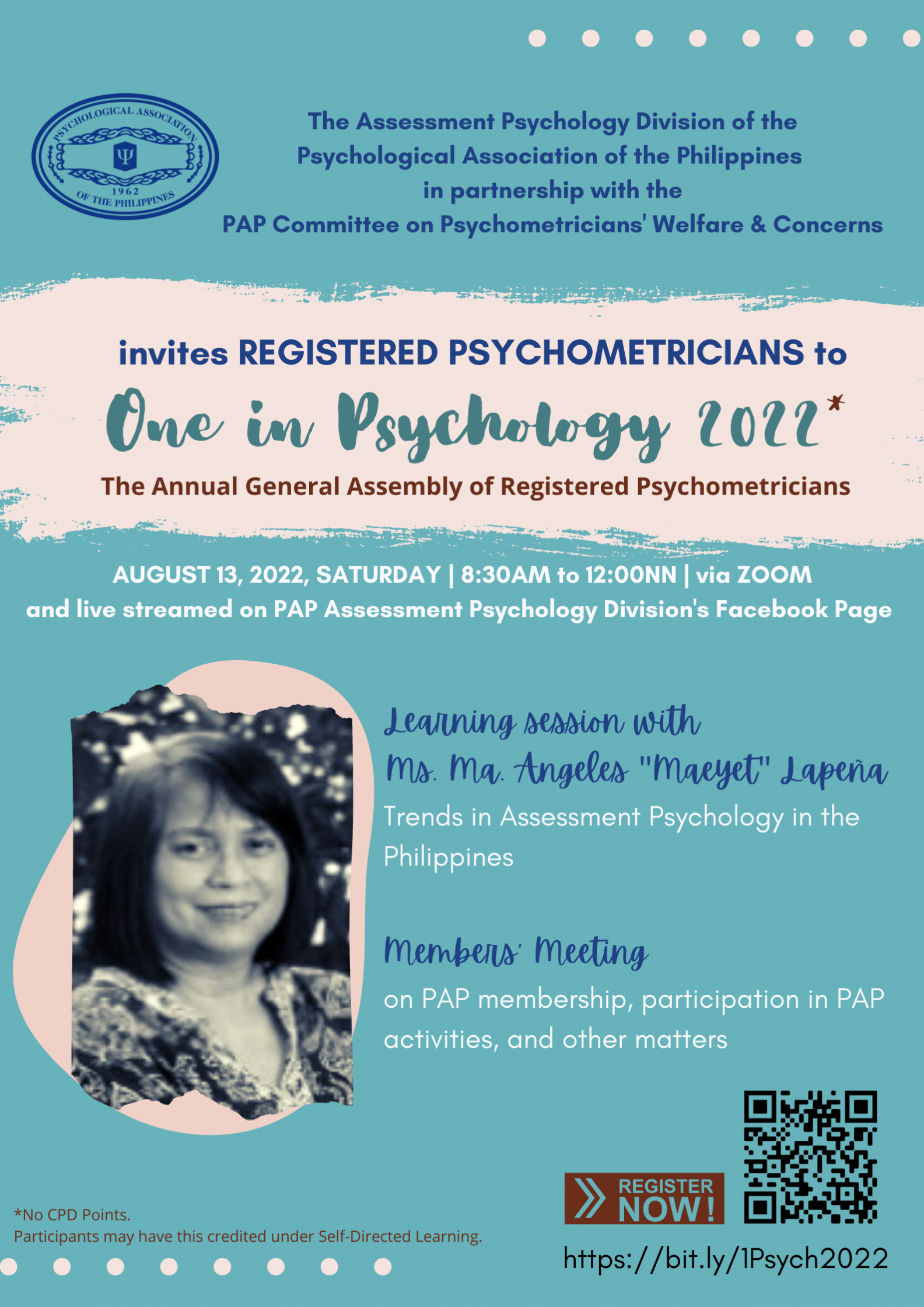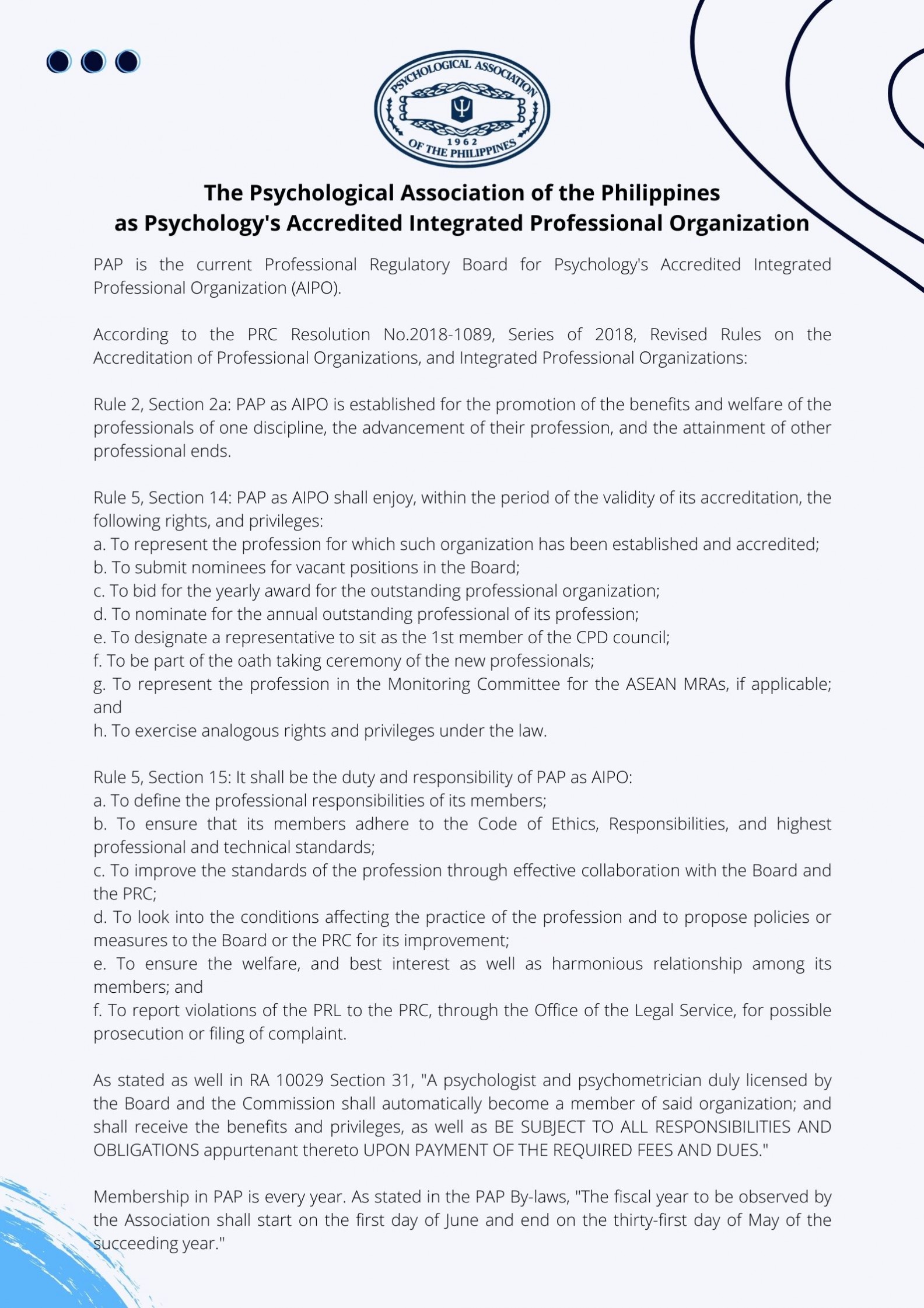 In line with this milestone, we encourage you to consider becoming a member of the Psychological Association of the Philippines (PAP), the nationally accredited professional organization for psychologists and psychometricians in the country. PAP serves as the leading body that upholds ethical standards, advances professional competence, and promotes the growth and development of psychology as a discipline and profession.