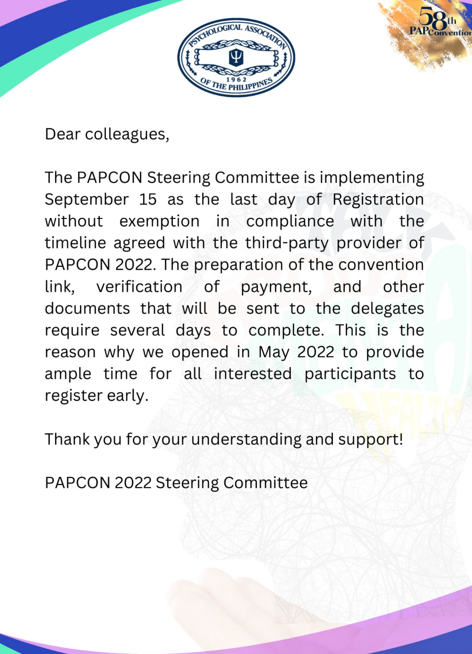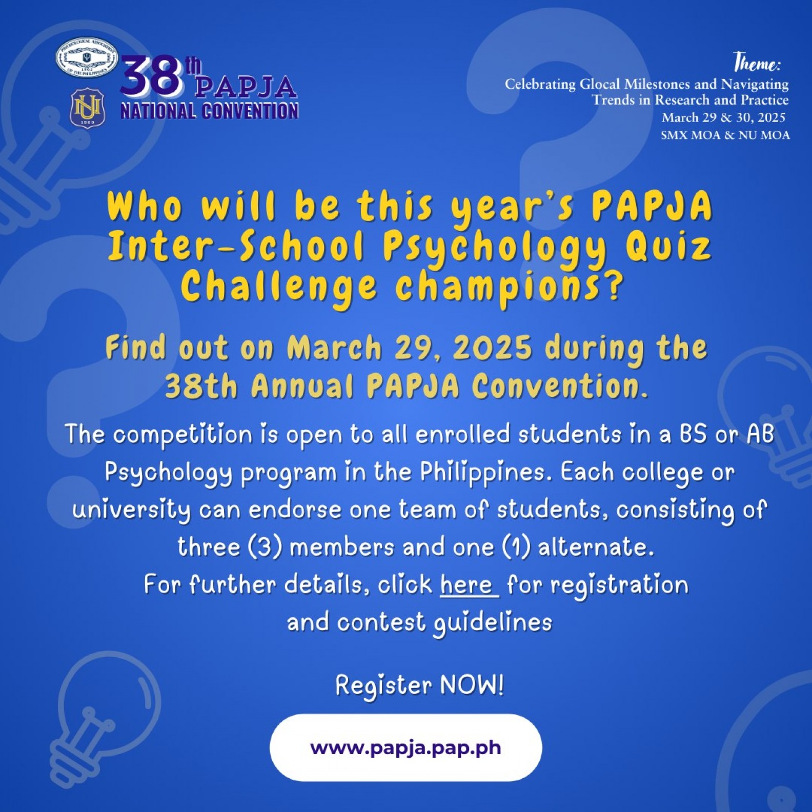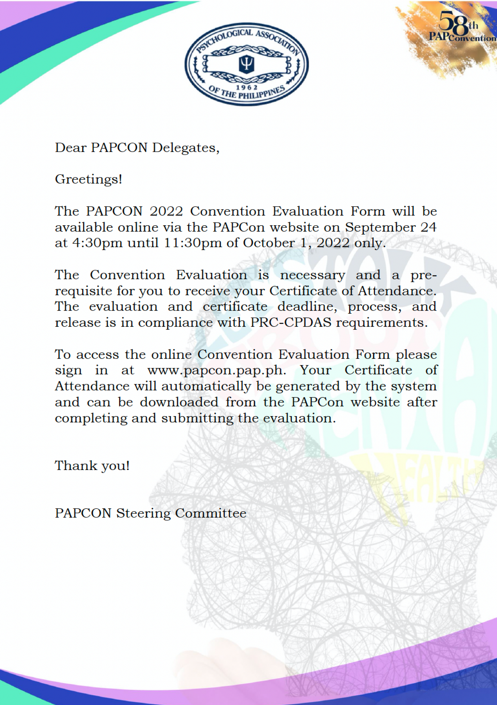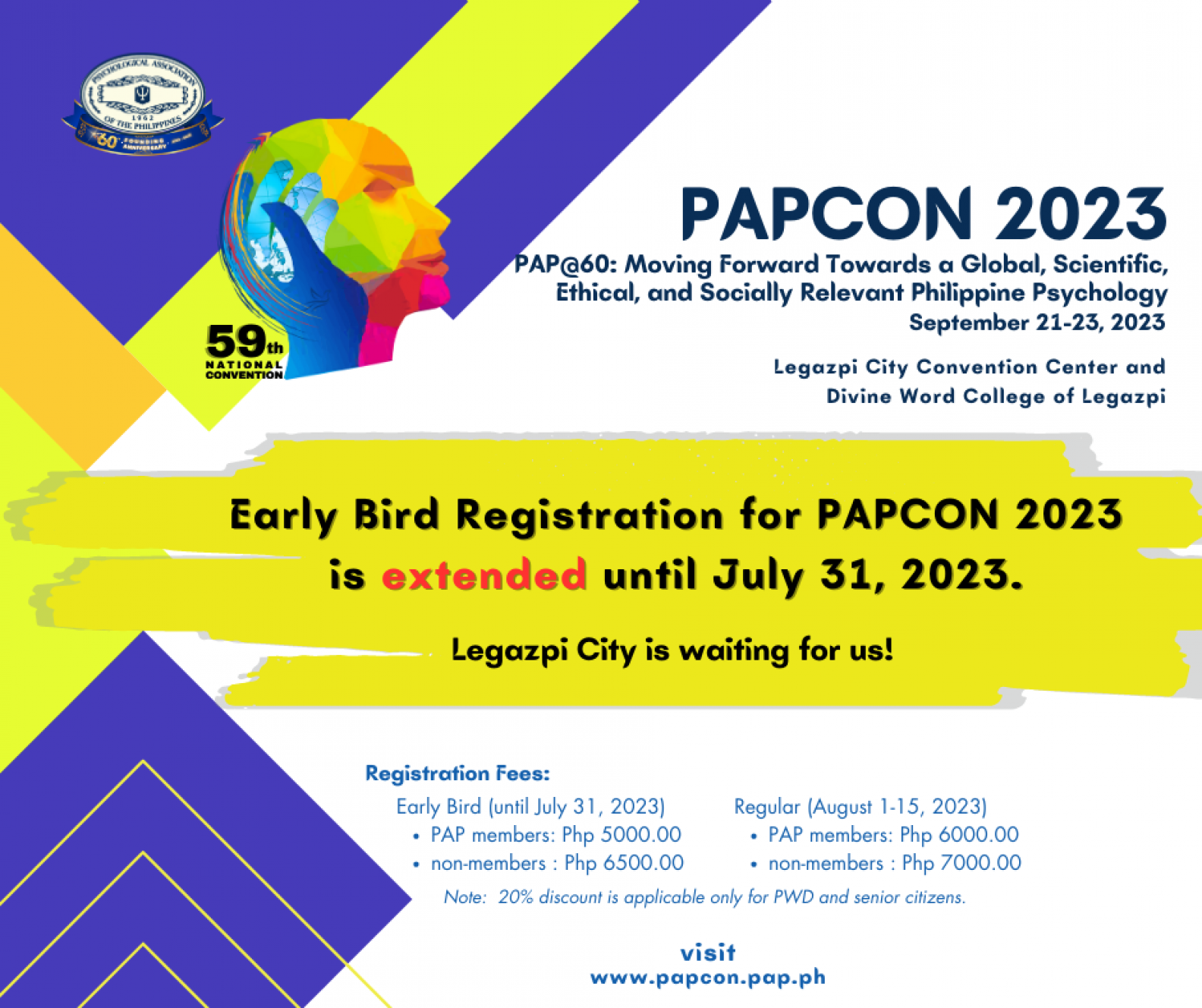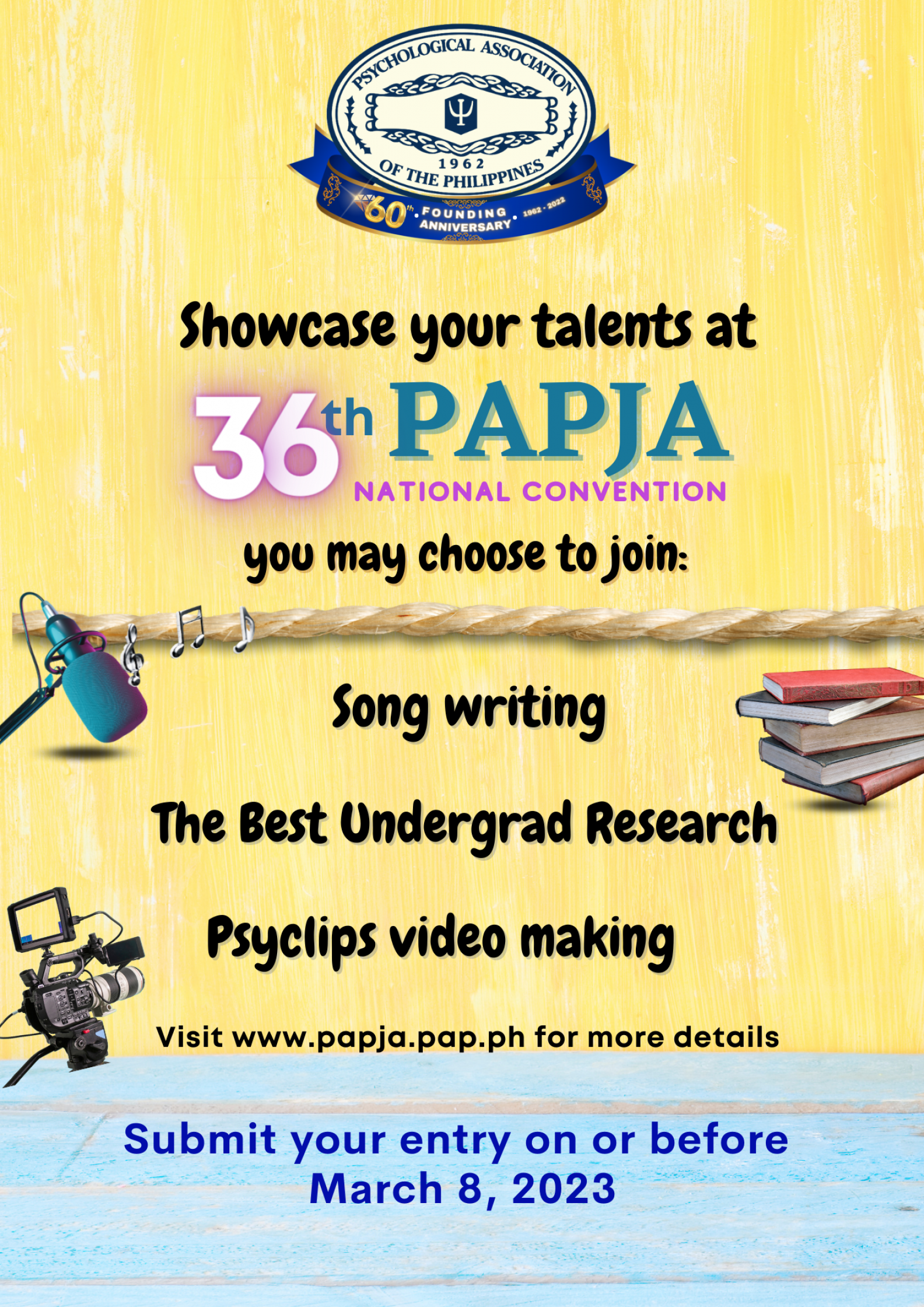 In line with this milestone, we encourage you to consider becoming a member of the Psychological Association of the Philippines (PAP), the nationally accredited professional organization for psychologists and psychometricians in the country. PAP serves as the leading body that upholds ethical standards, advances professional competence, and promotes the growth and development of psychology as a discipline and profession.