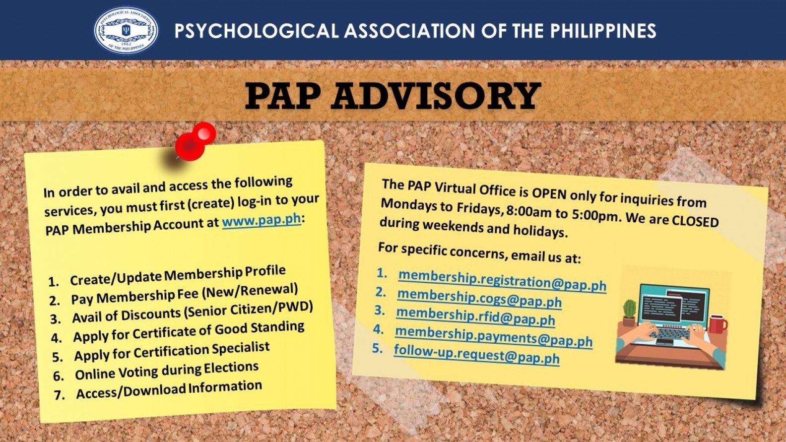 By becoming a PAP member, you will gain access to valuable professional benefits, including continuing professional development (CPD) opportunities, national and regional conventions, seminars, research collaborations, professional networking, and updates on policies and best practices in psychology. More importantly, membership enables you to be part of a strong professional community that supports your growth, protects your well-being, and advocates for your interests as a licensed practitioner.